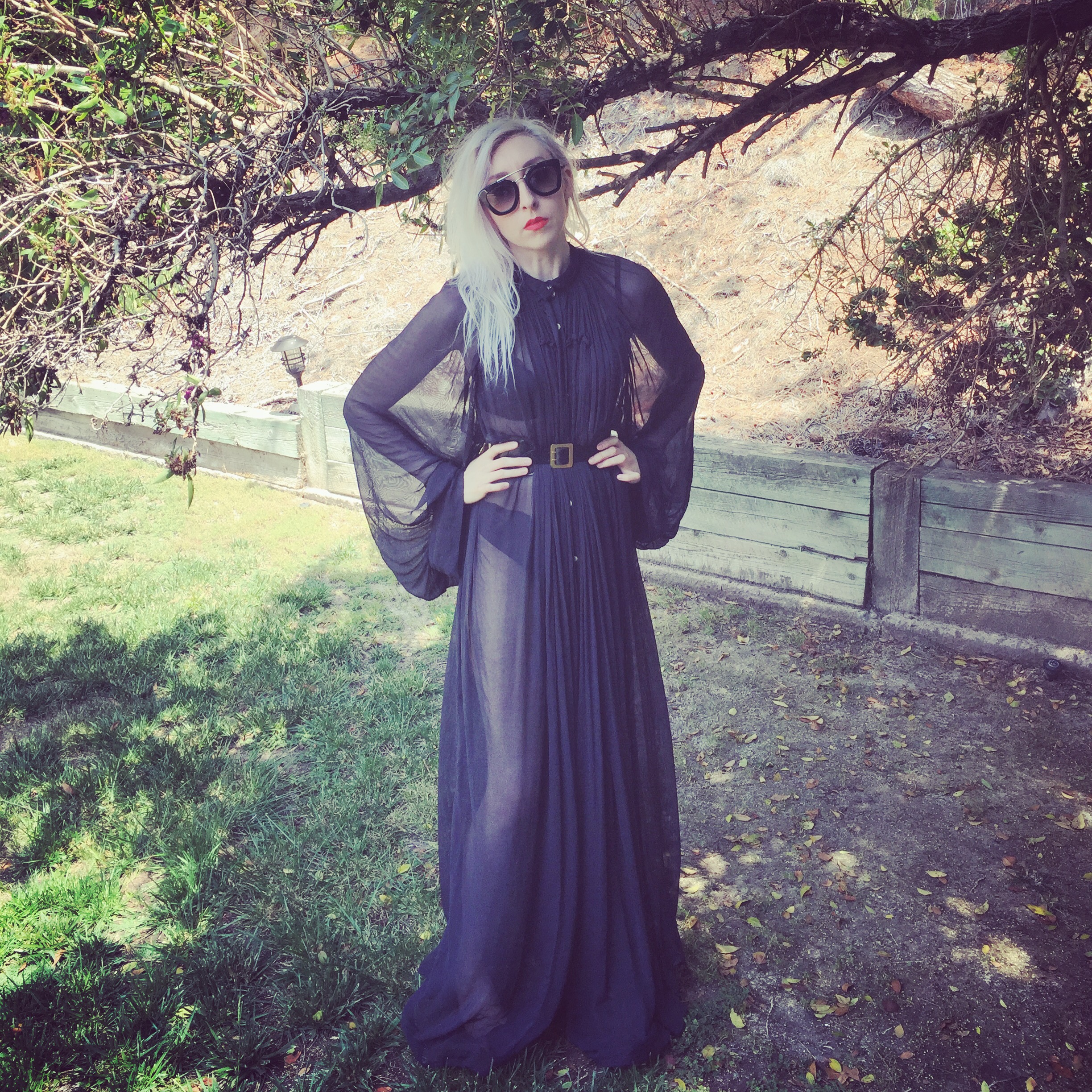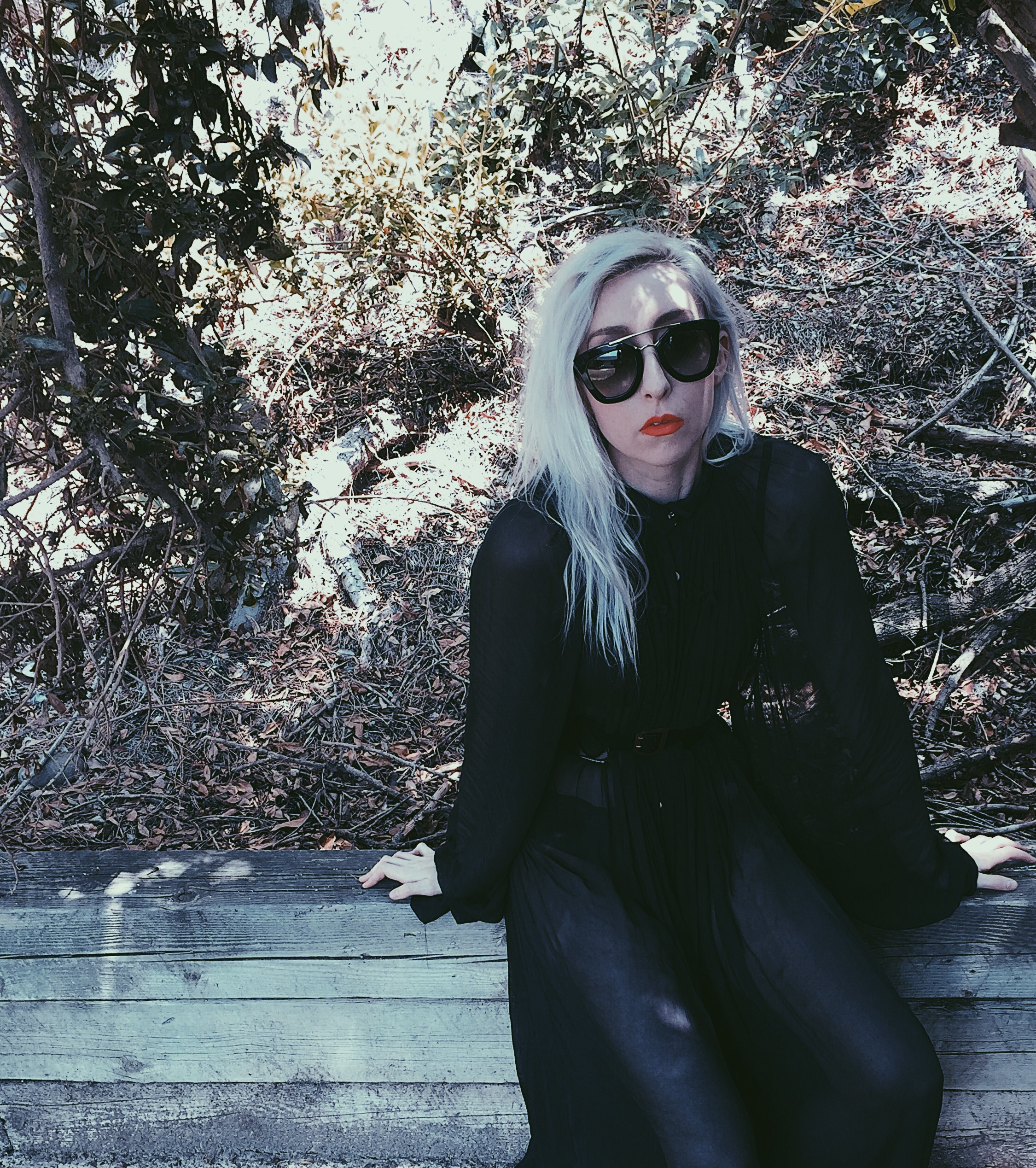 Summer is my least favorite season. I don’t have the constitution for heat and humidity, and the term ‘festival fashion’ fills me with dread. How does one fabulously goth it up when the weather conspires against dark dressing? The answer is in a trend that’s really been taking off the past couple of seasons: sheer. My favorite designer for summer is Ann Demeulemeester. Season after season, the house puts out light, floaty, convertible pieces that can be layered in winter and stripped down for summer. It helps that the fabrics are often breathable: cotton, linen, and loosely woven knits. This dress is a very breathable mesh that looks cool with opaque underpinnings. The bell sleeves are enormous and amazing. I’ve paired it with a thick Alexander McQueen waist belt and Prada sunnies, and one of my favorite lip colors from MAC to break up the monochromaticisn — My Darling Clementine.